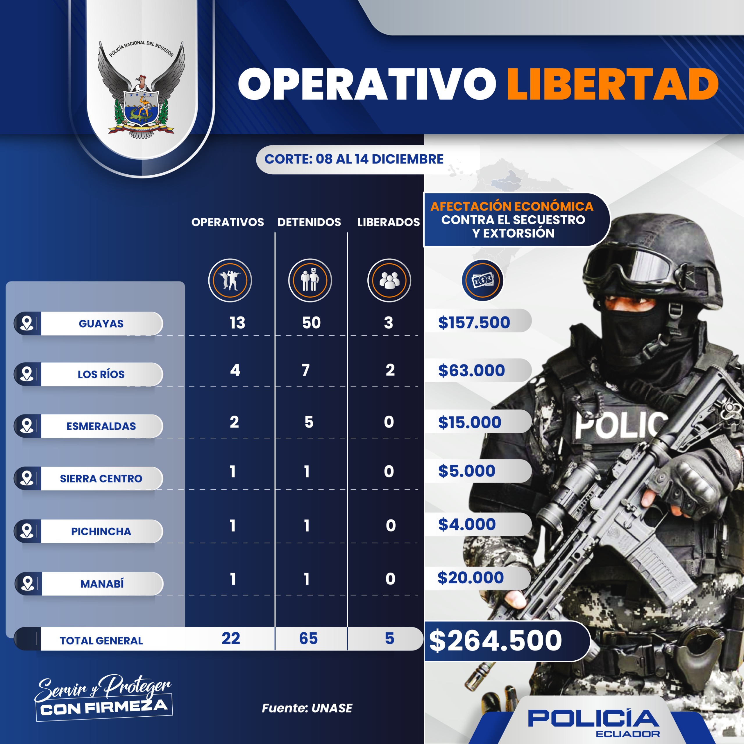 La Policía Nacional del Ecuador, a través de la Unidad Nacional Antisecuestro y Extorsión (UNASE), ejecutó 22 operativos denominados “Libertad”, entre el 8 y el 14 de dici